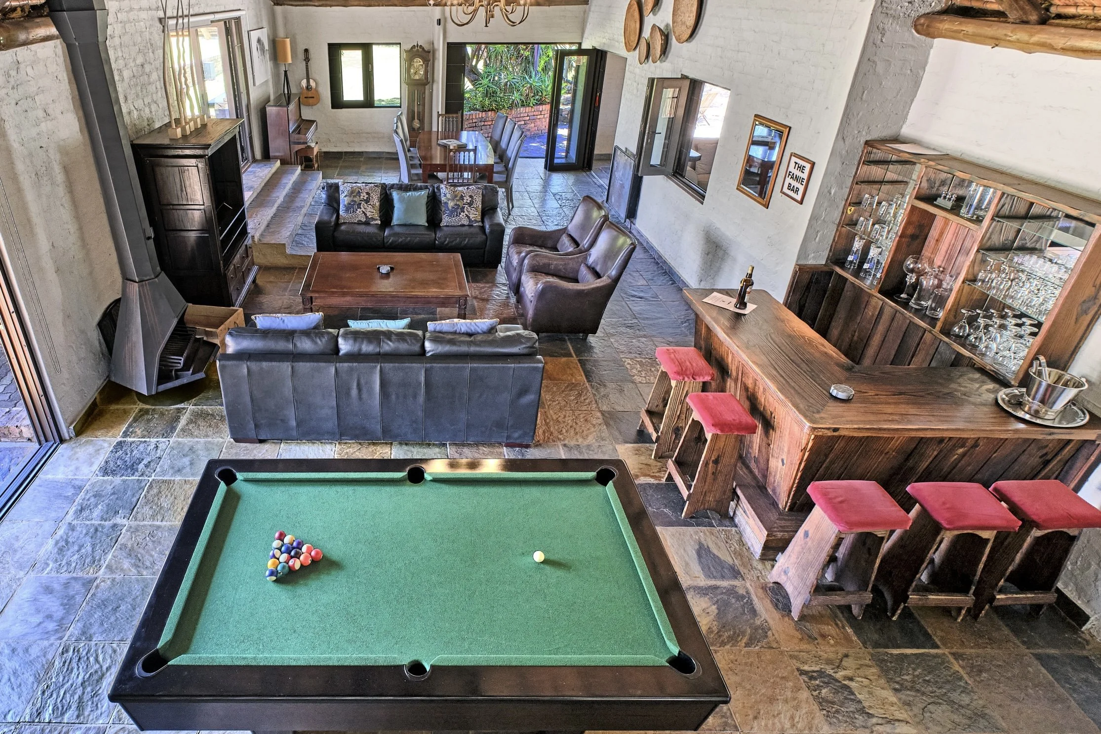 The Maluti Lodge sleeps 12 people in 6 bedrooms. The ground floor has 2 king bedrooms & 2 full bathrooms, Entertainment area with a pool table, bar, lounge and the incredible kitchen. The upstairs has 4 bedrooms and 1 full bathroom, a balcony & a tea/ coffee station and Pyjama lounge.